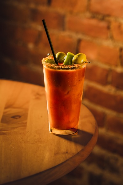 [Two James 28 Island Vodka, Bloody, Pickle, Olives, Lime, Dash of Cholula, Tajin Rim]